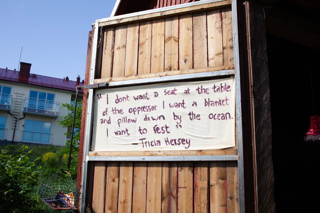 Don’t thank for the food by Antonia Atarah and collaborators is a performative installation inspired by the Ghanaian saying “don’t thank for the food, food is food, and everyone has to eat. ” The work celebrates the BIPOC community and radical joy through the themes of home, food, nurture, and rest. Picture©Emma_Reijonen