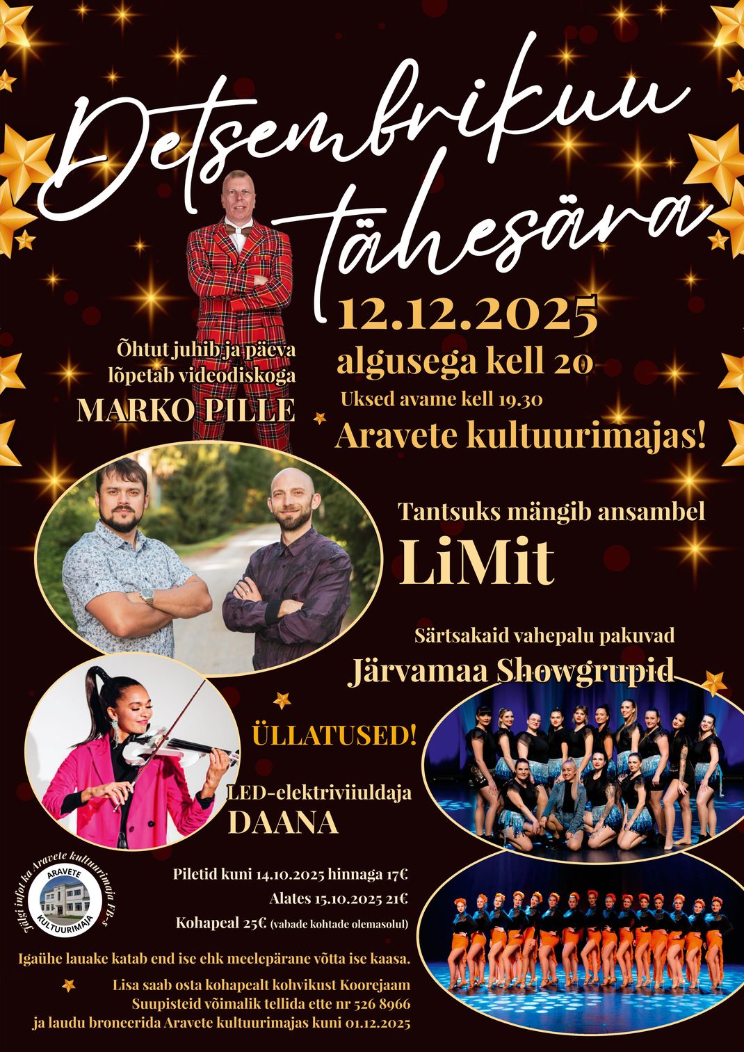 Suupisteid võimalik tellida ette nr 5268966 ja laudu broneerida Aravete kultuurimajas kuni 01.12.2025