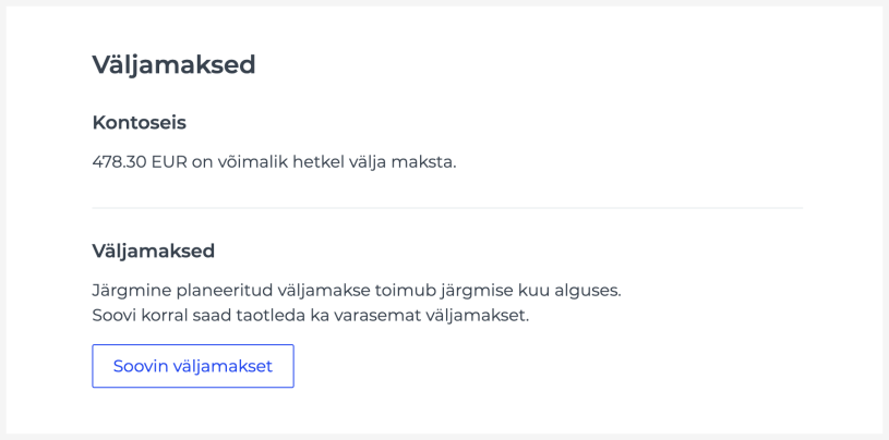 Vaikimisi maksame eelmise kuu laekumised välja järgmise kuu esimeste tööpäevade jooksul. Soovi korral saad ka varem väljamakset küsida – näiteks kui ainus üritus toimub kuu alguses, ei ole vaja raha järgmise kuu alguseni oodata.