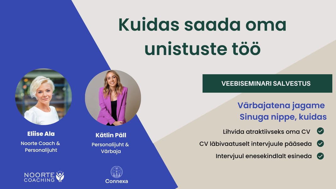 Kas oled väsinud lugematute CV-de saatmisest ilma tagasisidet saamata? Tänapäeva konkurentsitihedal tööturul on hädavajalik teada, kuidas silma paista ja oma tugevustega eristuda. Olukorras, kus ühele konkursile kandideerib 100–200 soovijat, on ülioluline, et just Sinu CV paistaks kõigi teiste seast silma, et pääseksid intervjuule ning kuidas intervjuul endast parim mulje jätta. Sellepärast oleme loonud veebiseminari, "Kuidas saada oma unistuste töö", mis aitab sul luua silmapaistva CV ning valmistuda intervjuuks, nii et just sina saaksid oma unistuste töö.