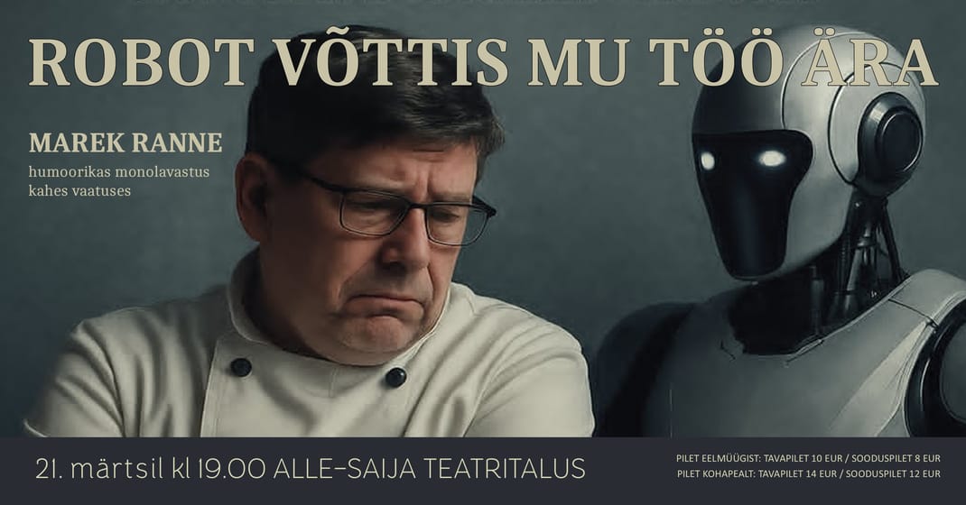Margus on tavaline keskklassi mees, kelle elu pööratakse pea peale, kui tema töökoha kööki saabub uus töötaja – tehisintellektil põhinev robotkokk. See on lugu tööst ilma jäämisest, väärikuse otsimisest ja inimeseks jäämisest ajastul, kus masinad mitte ainult ei tee tööd, vaid võtavad ka ruumi meie hinges. Laval kulgeb Marguse monoloog läbi humoorikate ja valusate hetkede – argipäevastest olukordadest kuni sügava eksistentsiaalse kriisini. Ta räägib personalijuhiga, vaidle juhatajaga, meenutab tööraamatut ja püüab mõista, millal inimene muutus kuluks. Lugu on vaimukas, emotsionaalne ja kriipivalt ajakohane – peegeldus ühiskonnast, kus tehnoloogia edusammud pole enam ulme, vaid igapäevane reaalsus. Ja keset seda seisab Margus – üks mees, kellelt võeti töö, kuid mitte hääl.