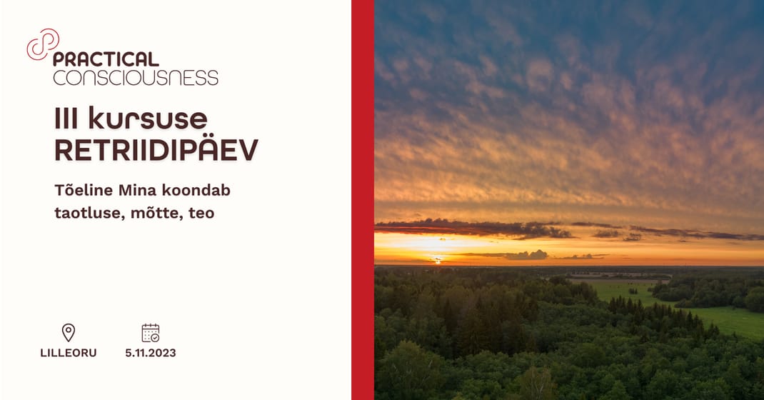 Practical Consciousness III kursuse retriidipäev on intensiivne täiendõppe formaat kuhu kutsume kõiki Practical Consciousness vähemalt III taseme läbinud õpilasi (Varasem Teadliku Muutuse Kunst), et koos praktiseerida ning tehnikad detailis selgeks lihvida.