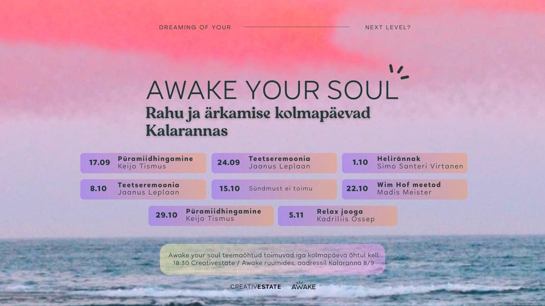 AWAKE YOUR SOUL teemaõhtud toimuvad iga kolmapäeva õhtul Creativestate ruumides, aadressil Kalaranna 8/9