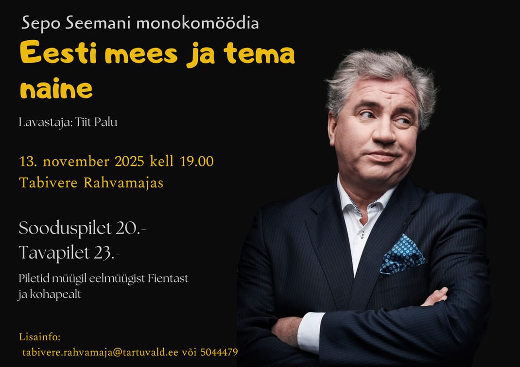 13. november 2025 kell 19.00 Tabivere Rahvamajas Sepo Seemani monokomöödia "Eesti mees ja tema naine".
