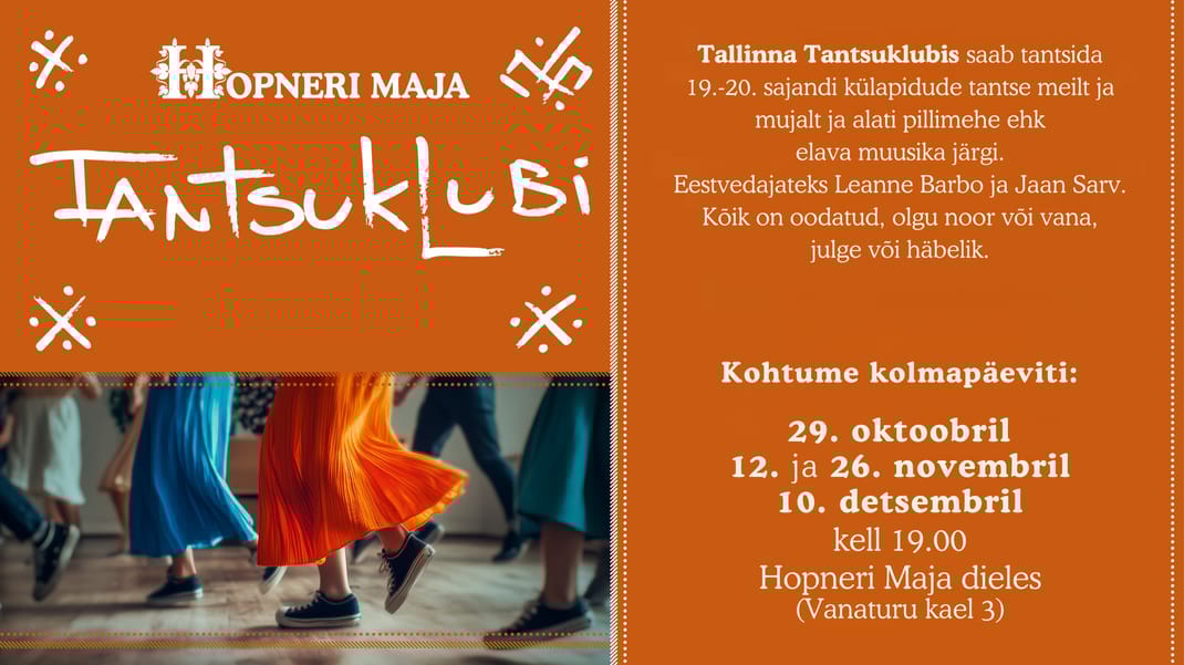 Tallinna tantsuklubi on nüüdseks juba 30 aastat tegutsenud rahvamuusika- ja rahvatantsuklubi. Algusaastatel tegutseti Vanalinna Muusikamajas ja Kloostri Aidas, nüüdseks on kokkusaamised juba mitme aasta jooksul toimunud Hopneri maja keskaegses dielesaalis.