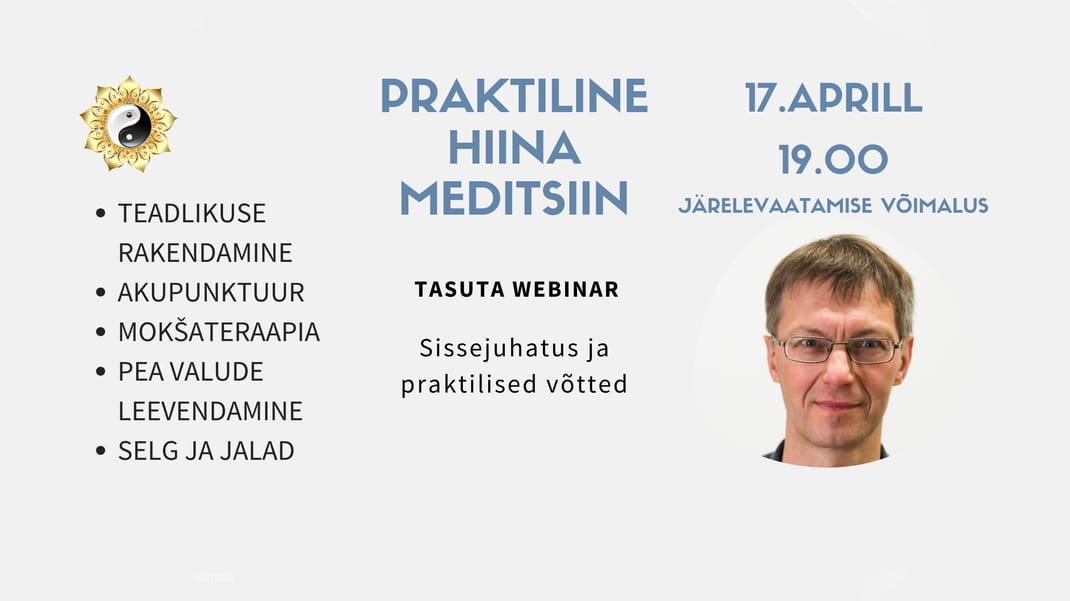 Tasuta veebinari viib läbi Toomas Õunap, kes on lõpetanud Hiina Meditsiini Neijingi kooli. Ta on Hiina Meditsiini koolituste ja kursuste läbiviija ja pikaaegne praktik, kellel on üle 24 aastane kogemus.