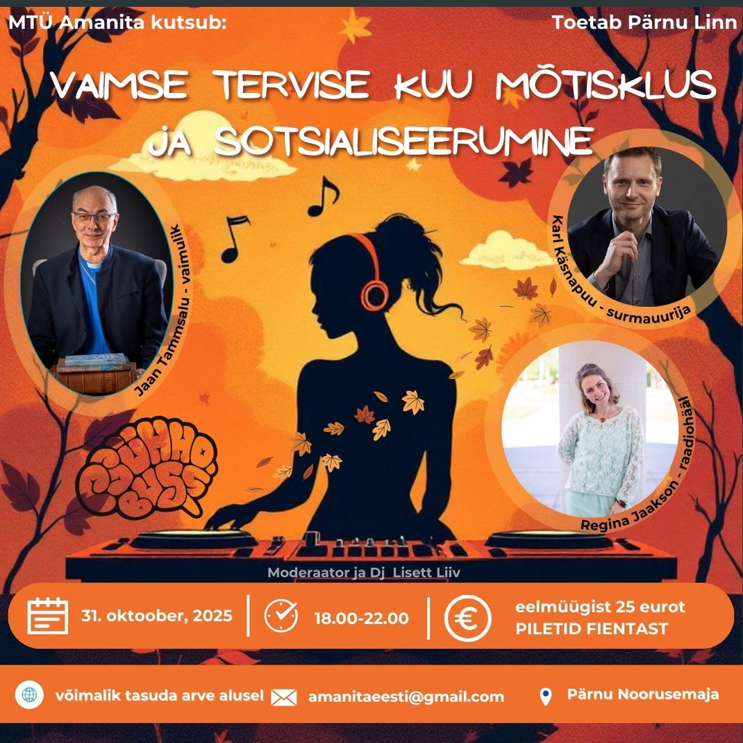 MTÜ Amanita kutsub kõiki huvilisi 31. oktoobril Pärnu Nooruse majja seminarile ja sotsialiseerumise õhtule „Vaimse tervise kuu mõtisklus“. Seminari eesmärk on suurendada osalejate teadlikkust ja enesekindlust vaimse tervise teemadel, pakkudes teadmisi, tuge ja inspireerivaid kogemusi. Üritus toob kokku spetsialistid ja kogukonna liikmed, et jagada teadmisi, arutada vaimse tervise hoidmise võimalusi ning leida uusi vaatenurki igapäevase heaolu toetamiseks. Üritusele on oodatud kõik Pärnu elanikud ja linna külastajad.