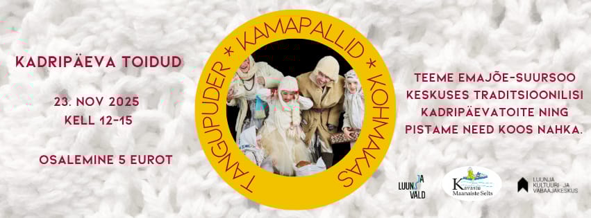 23. novembril kell 12-15 pöörame Emajõe-Suursoo keskuses pilgud traditsioonilistele kadripäeva toitudele - teeme koos ühe suure kohmaka, hulganisti kamapalle ja loomulikult ei puudu pliidilt ka ülimaitsev tangupuder. Töötuba sobib ka väiksematele tegelastele, kes saavad oma kätega teha pisikesi pallikesi. Oma koht on pliidil askeldamise kõrval ka kadripäeva lauludel ja juttudel.