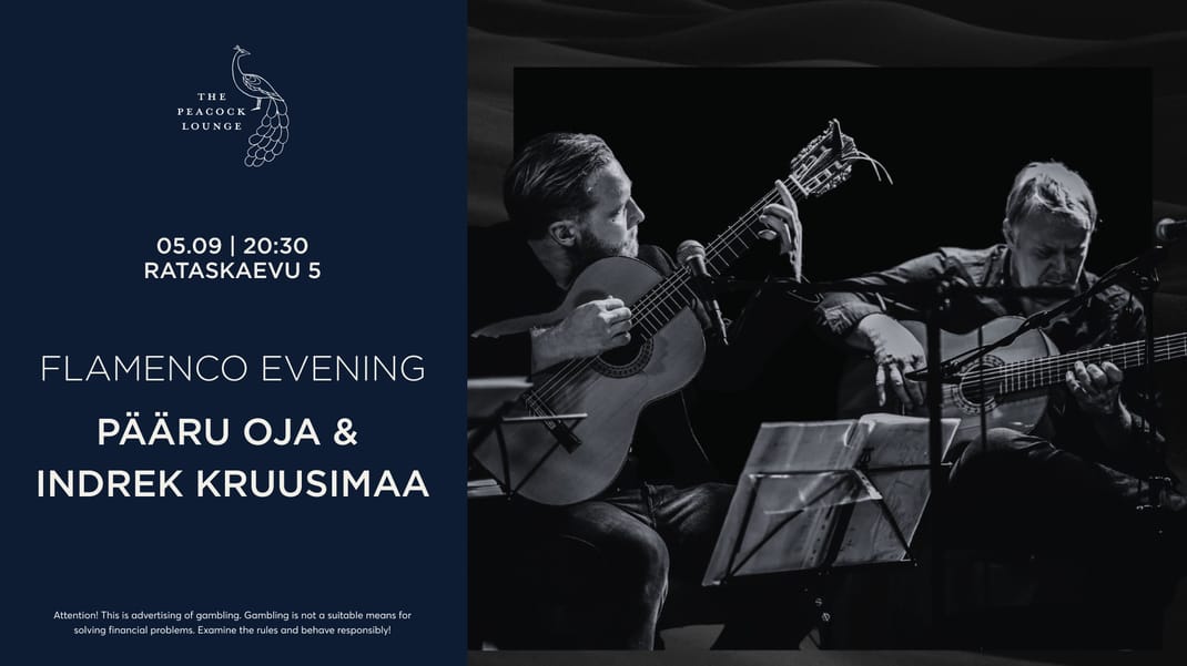 The Peacock Lounge invites you to an evening where music ignites the soul, as Pääru Oja and Indrek Kruusimaa blend the fiery spirit of flamenco with the elegance of masterful guitar.