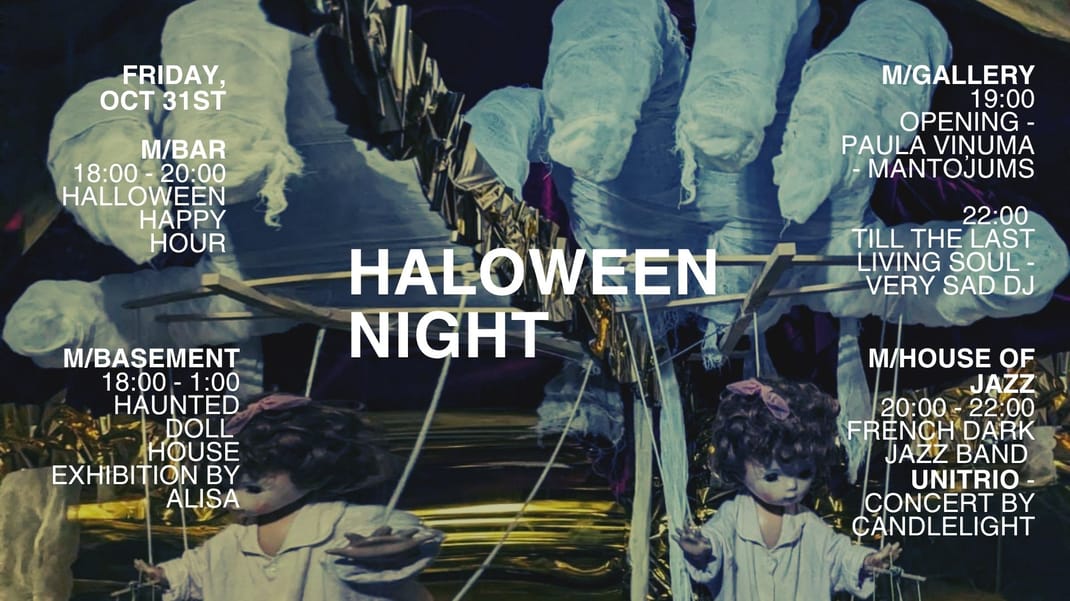 No 18:00 vakaru atklās Halloween Happy Hour M/BAR telpā. 19:00 M/Gallery tiks atklāta Paulas Viņumas izstāde “Mantojums”, kas caur glezniecību runā par atmiņu un cilvēka iekšējo pasauli. Tajā pašā laikā pagrabstāvā no 18:00 līdz 1:00 būs skatāma Alisas instalācija “Hunted Doll House” – sirreāla, nedaudz nemierīga telpa starp mākslu un sapni.