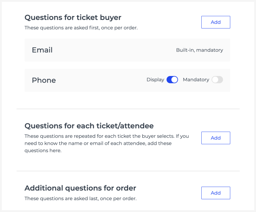 You can set up the order form at "Edit" > "Order form" in the event view. To add a question, choose whether you want to receive information once for the entire order or separately per each ticket/attendee.