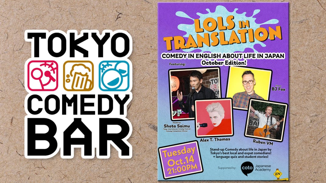 A stand-up comedy show (In English) about living in Japan & learning Japanese. Stories about daily life, love, the toilets and of course, frustration. Featuring Tokyo’s funniest comedians Language quizzes ands stories from audience members.