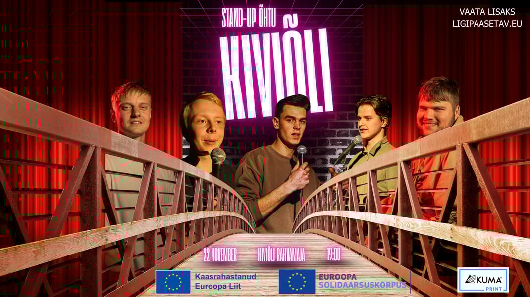 Kiviõli Rahvamajas toimub 22. november Euroopa Liidu poolt kaasrahastatud projekti “Ligipääsetav stand-up” raames tasuta stand-up õhtu, mille eesmärk on viia kaasaegne huumor ka nendeni, kes tavaliselt suurtesse keskustesse kultuuri nautima ei satu. Kiviõli ja teie äge rahvamaja sobivad selleks ideaalselt – oodata on ainulaadset ja meeldejäävat õhtut!
