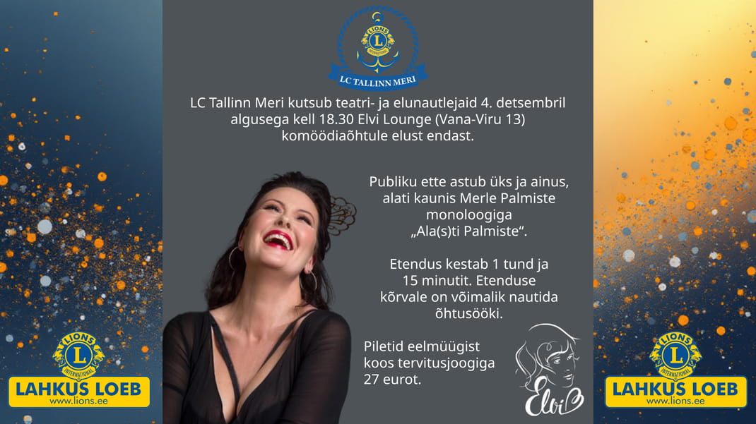 Lionsklubi Tallinn Meri kutsub kõiki teatri- ja elunautlejaid suurele komöödiaõhtule elust enesest, lahkusest, heategevusest. Publiku ette astub üks ja ainus, alati kaunis Merle Palmiste. Õhtu kava on vaba näitekirjaniku kirjutatud tekstist ning remarkidest, mille näitlejanna peaks pähe õppima, lavastaja kindlakäelistest suunistest ning loodetavasti ka kriitikute viisakalt vinguvast kriitikast.