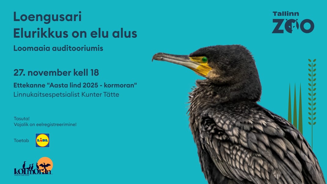 Loengusarja „Elurikkus on elu alus” raames toimub 27. novembril kell 18 Tallinna loomaaia auditooriumis põnev kohtumine linnukaitse spetsialist Kunter Tättega, kes räägib tänavusest aasta linnust, kormoranist.