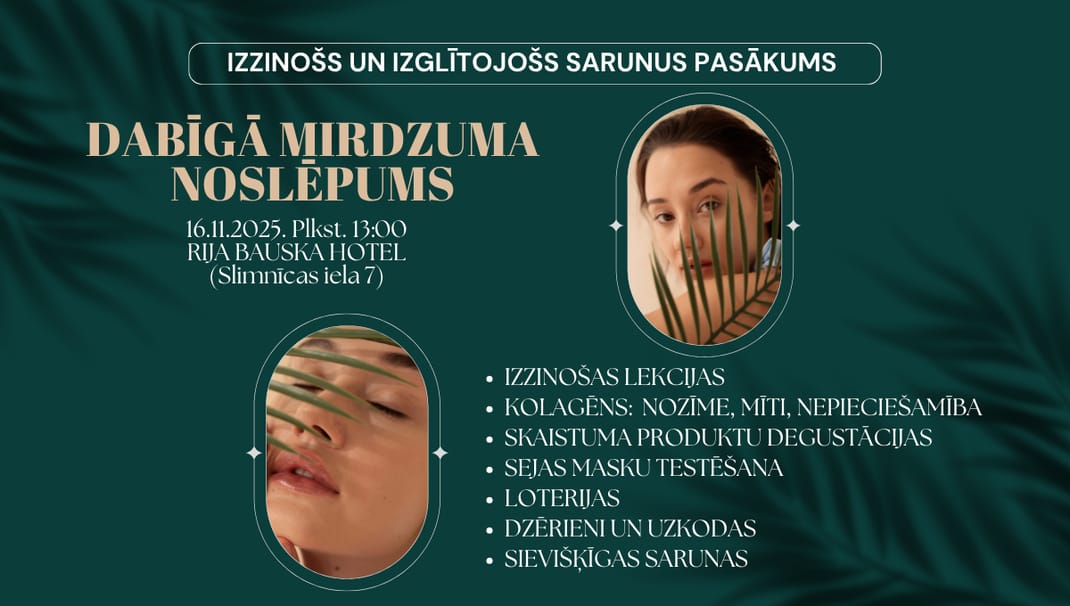 Aicinām Tevi 16.novembrī plkst. 13:00 uz īpašu pēcpusdienu Bauskā (RIJA Bauska hotel, slimnīcas iela 7), kur apvienosim skaistumu, zināšanas un iedvesmu. Atklāsim, kā harmonija starp ķermeni un prātu palīdz saglabāt veselību un dabisku starojumu. Iepazīsim dabas spēku, kvalitatīvus uztura un kolagēna produktus, kas palīdz justies un izskatīties lieliski.