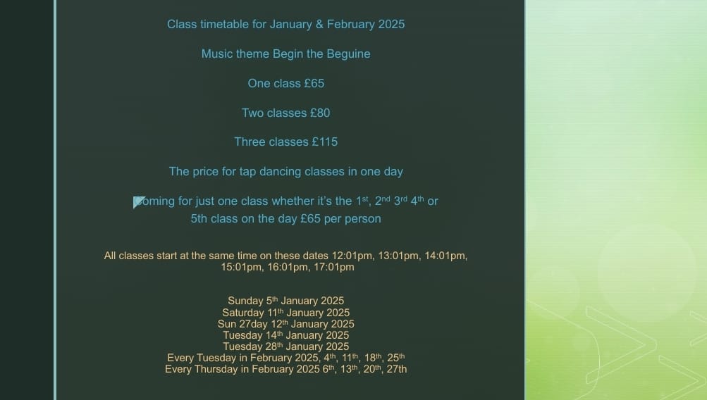 Scheduled up to six times a day all year on most days of the week, tap dancing classes in groups, purchase tickets in advance optional, class size average 10, up to 25, tap steps, practise, dancing and performing to music themes, in group classes. You may pair up to dance as couples or stay dancing on your own as part of the group. See the website on Google for videos and more information. Class 25-35 minutes with time to prepare for the 2nd class as new tap dancers may also join. Ticket dates and times are exchangeable to any scheduled class for the same price all year in 2025. Book your place or just choose when you want to come to Limehouse. Bring your paid ticket details with you, one time use only.